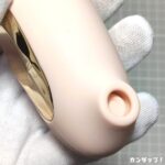 - 吸引機能オン。ボタンを長押ししてオンにし、短押ししてパターンを切り替えています。細かくて速い吸引で、クリが弱い方なら秒イキします。小さめの乳首ならスッポリと覆うこともできます。
